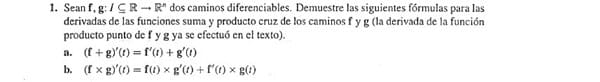 $$\begin{align}&f'(t)= \lim_{h\to 0}\frac{f(t+h)-f(t)}{h}\\ &\\ &\text{con esto}\\ &\\ &h'(t)=(f+g)'(t)=\lim_{h \to 0} \frac{(f+g)(t+h)-(f+g)(t)}{h}=\\ &\\ &\lim_{h\to 0}\frac{f(t+h)+g(t+h)-f(t)-g(t)}{h}=\\ &\\ &\lim_{h\to 0}\frac{f(t+h)-f(t)}{h}+\lim_{h\to 0}\frac{g(t+h)-g(t)}{h}=\\ &\\ &f'(t) + g'(t)\end{align}$$El producto vectorial es un producto que solo existe en R^3 su definición es