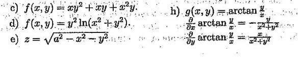 $$\begin{align}&f_x(xy^2+xy+x^2y)= y^2+y+2xy\\ &f_y(xy^2+xy+x^2y)= 2xy+x+x^2\\ &\\ &\\ &\\ &f_x(y^2ln(x^2+y^2))=\frac{2xy^2}{x^2+y^2}\\ &\\ &f_y(y^2ln(x^2+y^2))=2yln(x^2+y^2)+\frac{2y^3}{x^2+y^2}\\ &\\ &\\ &\\ &\\ &z_x(\sqrt{a^2-x^2-y^2})=-\frac{x}{\sqrt{a^2-x^2-y^2}}\\ &\\ &z_y(\sqrt{a^2-x^2-y^2})=-\frac{y}{\sqrt{a^2-x^2-y^2}}\\ &\\ &\\ &g_x(arctg \frac{y}{x})=\frac{-\frac{y}{x^2}}{1+(\frac{y}{x})^2}=\frac{-y}{x^2+y^2}\\ &\\ &g_y(arctg \frac{y}{x})=\frac {\frac{1}{x}}{1+(\frac{y}{x})^2} =\frac{1}{\frac{x^2+y^2}{x}} = \frac{x}{x^2+y^2}\\ &\end{align}$$Y eso es todo. Perdona si no está muy bien, pero es complicado escribir este tipo de fórmulas y con el editor de esta página aun más.
