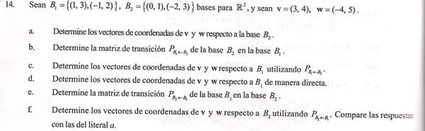 f) Determine las coordenadas de v y w respecto a B2 usando la matriz de transición recién calculada.