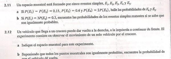 2.11 a) La suma de todas las probabilidades es 1 luego 0,15+ 0,15 + 0,4 + 2P(E5) + P(E5) = 1 3P(E5) = 1 - 0,70 3P(E5) = 0,3 P(E5) = 0,3 / 3 = 0,1 P(E4) = 0,2 P(E5) = 0,1 b) P(E1) = 0,3 3P(E2) = 0,3 P(E2) = 0,3 / 3 = 0,1 P(E1) + P(E2) = 0,3 + 0,1 = 0,4 Luego la probabilidad restante es 1 - 0,4 = 0,6 Como los tres sucesos que quedan son igualmente probables: 3P(E3) = 0,6 P(E3) = 0,6 / 3 = 0,2 P(E3) = P(E4) = p(E5) = 0,2 -------------- 2.12 No lo entiendo. O falta parte del problema o no sé que es un crucero, que creo que será un cruce, ¿no? No sé que significa entonces que dé la vuelta a no ser que se combines varios cruces. No tengo nada claro el problema.