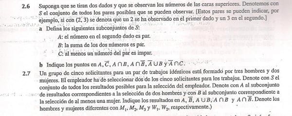 Dianis 1556! 2.6 a) A ={(1,2)(1,4)(1,6)(2,2)(2,4)(2,6)(3,2)(3,4)(3,6)(4,2)(4,4)(4,6)(5,2)(5,4)(5,6)(6,2)(6,4)(6,6)} B={(1,1)(1,3)(1,5)(2,2)(2,4)(2,6)(3,1)(3,3)(3,5)(4,2)(4,4)(4,6)(5,1)(5,3)(5,5)(6,2)(6,4)(6,6)} C ={(1,1)(1,2)(1,3)(1,4)(1,5)(1,6)(2,1)(2,3)(2,5)(3,1)(3,2)(3,3)(3,4)(3,5)(3,6)(4,1)(4,3)(4,5)(5,1)(5,2)(5,3)(5,4)(5,5)(5,6)(6,1)(6,3)(6,5)} b) -C = {(2,2)(2,4)(2,6)(4,2)(4,4)(4,6)(6,2)(6,4)(6,6)} AnB = {(2,2)(2,4)(2,6)(4,2)(4,4)(4,6)(6,2)(6,4)(6,6)} A n -B = {(1,2)(1,4)(1,6)(3,2)(3,4)(3,6)(5,2)(5,4)(5,6)} -A U B = {(1,1)(1,3)(1,5)(2,1)(2,2)(2,3)(2,4)(2,5)(2,6)(3,1)(3,3)(3,5)(4,1)(4,2)(4,3)(4,4)(4,5)(4,6)(5,1)(5,3)(5,5)(6,1)(6,2)(6,3)(6,4)(6,5)(6,6)} -A U C ={(1,1)(1,3)(1,5)(2,1)(2,2)(2,3)(2,4)(2,5)(2,6)(3,1)(3,3)(3,5)(4,1)(4,2)(4,3)(4,4)(4,5)(4,6)(5,1)(5,3)(5,5)(6,1)(6,2)(6,3)(6,4)(6,5)(6,6)} ----------- 2.7 S = {(M1,M2)(M1,M3)(M1,W1)(M1,W2)(M2,M3)(M2,W1)(M2,W2)(M3,W1)(M3,W2)(W1,W2)} A = {(M1,M2)(M1,M3)(M2,M3)} B = {(M1,W1)(M1,W2)(M2,W1)(M2,W2)(M3,W1)(M3,W2)(W1,W2)} -B = {(M1,M2)(M1,M3)(M2,M3)} A U B = {(M1,M2)(M1,M3)(M1,W1)(M1,W2)(M2,M3)(M2,W1)(M2,W2)(M3,W1)(M3,W2)(W1,W2)} A n B = vacio A n -B = {(M1,M2)(M1,M3)(M2,M3)} Y eso es todo. Si algo no lo entiendes me lo dices y te lo explico. No los veo difíciles aunque hay que estar atento.