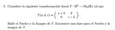 El núcleo serán los elementos de R3 tales que su imagen es la matriz nula. Luego son elementos (a,b,c) tales que a+b=0 c-b=0