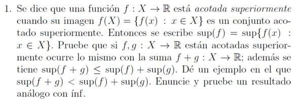Por lo visto antes Sup(f)+Sup(g) es una cota superior de (f+g)(X). Como el supremo es la menor de las cotas superiores se cumplirá