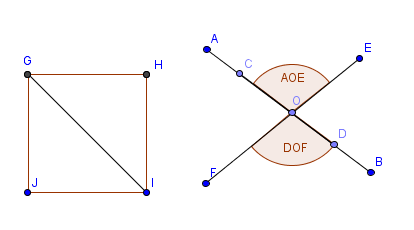 2. Sean los segmentos de recta AB, CD y EF; tal que los segmentos se cortan en un punto O. Si los angulos son AOE = DOF, entonces el segmento de recta EF, es la bisectriz de los angulos AOE y DOF.