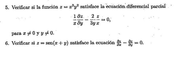 Matemáticas clayre73 el 25 feb. 12 Calculo 3 derivadas parciales F Seguir Siguiendo Dejar de seguir 1 respuesta Respuesta de Valero Angel Serrano Mercadal 1 1 Valero Angel Serrano Mercadal, Me voy x tiempo. Necesito hacer otras cosas, descansar y que... 5.Hay que calcular la derivada parcial respecto yfy(×^3·y^2)=2yx^32yx^3/× - 2x^3·y^2/(3yx) = 2yx^2 - 2yx^2/3 = 4yx^2/3Luego no la verifica.6.fx(sen(×+y)) = cos(×+y)fy(sen(×,y)) = cos(×+y)Y evidentementecos(×+y) - cos(×+y) = 0Luego se cumple la ecuación.Y eso es todo. el 29 feb. 12 - Anónimo ahora mismo Añadir comentario Usa los comentarios si quieres aportar algo a esta respuesta. No los utilices para preguntar algo nuevo. Cancelar Enviar