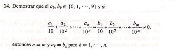 $$\begin{align}&\frac{a_1}{10}+···+\frac{a_n}{10^n}+\frac{a_{n+1}}{10^{n+1}} = \frac{b_1}{10}+···+\frac{b_m}{10^m}\\ &\\ &\text{Pasamos }\frac{b_{n+1}}{10^{n+1}}\text{ al otro lado}\\ &\\ &\frac{a_1}{10}+···+\frac{a_n}{10^n}=\frac{b_1}{10}+···+ \frac{b_{n+1}-a_{n+1}}{10^{n+1}}+\frac{b_m}{10^m}\end{align}$$