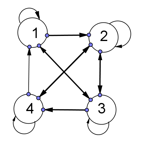 Y es aperiódica porque al 1 puede volver mediante 1-->3-->1 y mediante 1-->3-->4-->1, eso es en 2 o en 3 pasos y el mcd(2,3)=1