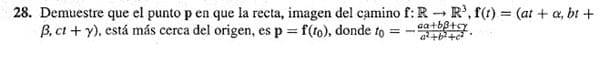 $$\begin{align}&f(t)=(at+\alpha)^2+(bt+\beta)^2+(ct+\gamma)^2\\ &\\ &\text {derivamos e igualamos a 0}\\ &\\ &f'(t) = 2a(at+\alpha)+ 2b(bt+\beta)+ 2c(ct+\gamma)=0\\ &\\ &a(at+\alpha)+ b(bt+\beta)+ c(ct+\gamma)=0\\ &\\ &a^2t+a\alpha+b^2t+b\beta+c^2t+c\gamma = 0\\ &\\ &(a^2+b^2+c^2)t= - (a\alpha+b\beta+c\gamma)\\ &\\ &t= - \frac{a\alpha+b\beta+c\gamma}{a^2+b^2+c^2}\end{align}$$ Luego sale el punto que dice el enunciado, es un punto crítico. Para ver si es un máximo o mínimo relativo se puede hacer de dos formas.