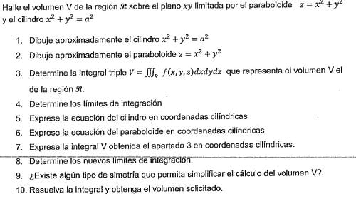 Te dejé una cuestión de hallar el cálculo del volumen, te dejo el ejercicio para que lo veas mejor. Como te he comentado más que en la resolución tengo dudas en el enunciado, sobre el volumen que quedaría encerrado...