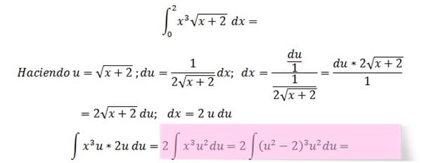 Estoy revisando un procedimiento de integración. En la parte que marco con color,podrás observar que aparece una "x" elevada a la tercera potencia. En el siguiente paso, se observa que esa "x" fué sustituida por [(u^2)-2] elevado a la 3.