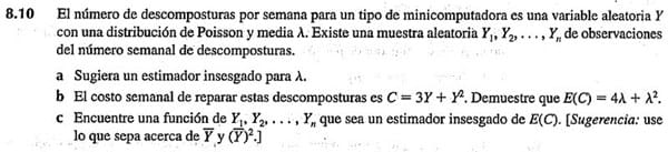 $$\begin{align}&E(\overline{Y}^{\,2}) =\frac{E[(Y_1+ Y_2+...+Y_n)^2]}{n^2}=\\ &\\ &\frac{E(Y_1^2)+E(Y_2^2)+...+E(Y_n^2)+\sum_{i \ne j}E(Y_iY_j)}{n^2}=\\ &\\ &\text{Como las }Y_i \text {son independientes }E(Y_iY_j)=E(Y_i)E(Y_j)=\lambda^2\\ &\\ &\frac{n(\lambda +\lambda^2)+2\binom{n}{2}\lambda^2}{n^2}=\\ &\\ &\frac{n(\lambda+\lambda^2)+n(n-1)\lambda^2}{n^2}=\\ &\\ &\frac{\lambda+\lambda^2+(n-1)\lambda^2}{n}=\frac{\lambda+n\lambda^2}{n} = \frac{\lambda}{n}+ \lambda^2\end{align}$$Vamos a construir una función de la media y la media al cuadrado tal que se esperanza sea la esperanza de C, como ya sabemos las esperanzas de la medía y la media al cuadrado, haremos una función que sea combinación lineal de ellas y será fácil ajustar la esperanza de esa función