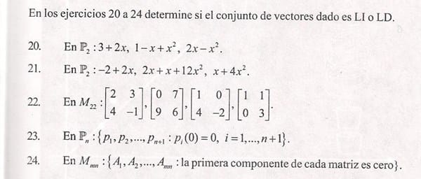 24. El razonamiento es como el anterior. Una base de las matrices mxn tiene mn elementos. Aquí tenemos mn matrices pero no son una base porque el sistema no es generador, ya que cualquier matriz con la primera componente no nula no puede expresarse como combinación lineal de estas. Y un conjunto con el número de elementos de la base que no es base es un sistema linealmente dependiente.