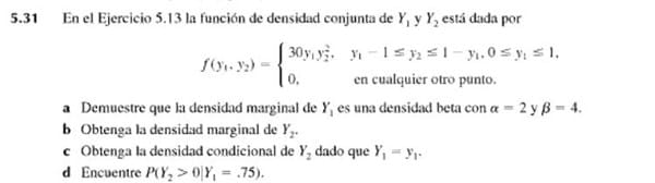 $$\begin{align}&f_1(y_1)=\int_{-1+y_1}^{1-y_1}30y_1y_2^2dy_2 =\\ &\\ &\\ &10y_1\left[y_2^3 \right]_{-1+y_1}^{1-y_1}=10y_1[(1-y_1)^3-(y_1-1)^3]=\\ &\\ &\\ &20y_1(1-y_1)^3\\ &\end{align}$$Recuerdo que por los exponentes de y1 y (1-y1) puede ser una beta(2,4), pero voy a buscar la definición de la beta para confirmarlo seguro, esta en la página 194