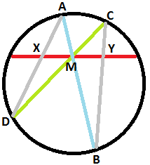 Dada una cuerda PQ de una circunferencias, sean otras dos cuerdas cualesquiera AB y CD tales que pasan por M, punto medio de PQ. Las cuerdas AD y BC cortan a PQ en los puento X y Y, entonces M es punto medio de XY