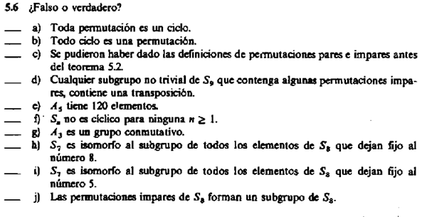 j) Falso. Las permutaciones impares nunca pueden formar un subgrupo ya que no cuentan con el elemento neutro entre sus filas. El elemento neutro es una permutación par.