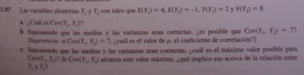 Pero esto no puede ser porque el coeficiente de correlación toma valores entre -1 y 1 y lo que ha salido es mayor que 1, luego la covarianza no puede ser 7.