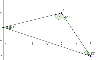 C = 180º-A-B = 37.874984