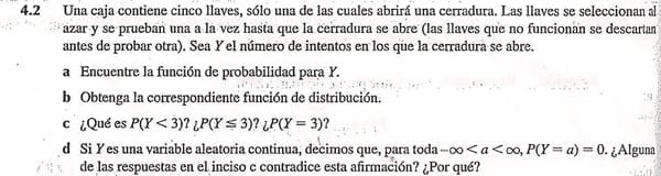 La probabilidad de abrír en cada intento es 1/5 porque hay 5 llaves. Supón que las desordenamos, y luego las usamos en orden. La probabilidad que la la buena sea la primera, segunda, tercera, cuarta o quinta es la misma.