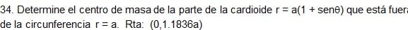 $$\begin{align}&m=\int_Cdm=\\ &\\ &\text{Sea }\gamma \text{ la densidad}\\ &\\ &=\int_{area}\gamma dS=\\ &\\ &\\ &\gamma\int\int_{area}dxdy =\\ &\\ &\gamma\int_0^{\pi}\int_a^{a(1+sent)}r\,dr\,dt=\\ &\\ &\gamma \int_0^{\pi}\left[\frac{r^2}{2}\right]_a^{a(1+sent)}dt=\\ &\\ &\gamma\int_0^{\pi}\left(\frac{a^2(1+sent)^2}{2}-\frac{a^2}{2}\right)dt=\\ &\\ &\frac{\gamma a^2}{2}\int_0^{\pi}(sen^2t+2sent)dt=\\ &\\ &Como \quad sen^2t=\frac{1-\cos\,2t}{2}\\ &\\ &=\frac{\gamma a^2}{2}\int_0^{\pi} \left(\frac{1-\cos\,2t}{2}+2sent\right)dt=\\ &\\ &\frac{\gamma a^2}{2}\left[\frac t2-\frac{sen\, 2t}{4}-2cost \right]_0^{\pi}=\\ &\\ &\frac{\gamma a^2}{2} \left(\frac {\pi}2-0+2-0+0+2\right)=\\ &\\ &\frac{\gamma a^2(\pi+8)}{4}\end{align}$$Y ahora la del numerador, la diferencia es la la integral tiene una y que debe ser sustituida por su espresión equivalente en coordenadas polares que es x = r·sent