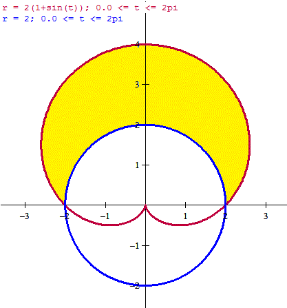La figura roja es el cardiode, la azul la circunferencia y nos piden hallar el centro de masas de la figura que he pintado en amarillo. Sobre la coordenada x del centro de masas no haremos ninguna cuenta, la figura es simétrica respecto al eje Y y por tanto el centro de masas tiene coordenada x=0.