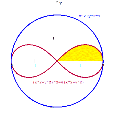 $$\begin{align}&(x^2+y^2)^2=4(x^2-y^2)\\ &(\rho^2cos^2 \theta+\rho^2sen^2\theta)^2=4(\rho^2cos^2 \theta-\rho^2sen^2\theta)\\ &(\rho^2)^2=4\rho^2(\cos^2\theta-sen^2\theta)\\ &\rho^2 = 4cos(2\theta)\end{align}$$El ángulo theta necesario para barrer la figura amarilla empieza en 0 y termina cuando el radio vector es cero