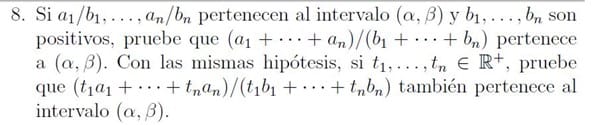 $$\begin{align}&\alpha \lt \frac{a_i}{b_i}\lt \beta\\ &\\ &\\ &\alpha \lt \frac{t_ia_i}{t_ib_i}\lt \beta\\ &\\ &\\ &\text{como }t_ib_i \ge 0 \text { podemos hacer}\\ &\\ &\alpha t_ib_i \lt t_ia_i \lt \beta t_ib_i\\ &\\ &\text {los sumamos todos}\\ &\\ &\alpha \sum_{i=1}^nt_ib_i \lt \sum_{i=1}^n t_ia_i \lt \beta \sum_{i=1}^n t_ib_i\\ &\\ &\text {y como el sumatorio de los b es positivo}\\ &\\ &\alpha \lt \frac{\sum_{i=1}^n t_ia_i}{\sum_{i=1}^nt_ib_i} \lt \beta\end{align}$$
