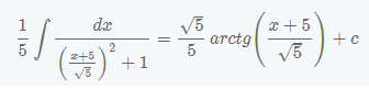 $$\frac {\sqrt 5}{5} arctg \left( \frac{x+5}{\sqrt 5} \right ) +c$$Y eso es todo. Apréndelo por favor, el uso del editor de ecuaciones es muy pesado y hay que permitir saltarse los pasos que sean más sencillos.