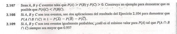Dianis 1556! 2.107 Veamos exactamente cuanto valen P(A|C) y P(B|C) P(A|C) = P(AnC) / P(C) P(B|C) = P(BnC) / P (C) Nos piden que el primero sea menor P(AnC) / P(C) < P(BnC) / P (C) ==> P(AnC) < P(BnC) Pues hagamos el ejemplo del lanzamiento de dos dados Sean: A = el evento de que sumen 7 B = el evento de que sumen 2 o 3 C = el evento de sacar 1 en el primer dado Se cumple la hipótesis P(A) > P(B) puesto que A = (1,6)(2,5)(3,4)(4,3)(5,2)(6,1) tiene probabilidad P(A) =6/36 = 0,16666 B = (1,1)(1,2)(2,1) tiene probabilidad P(B)=3/36 = 0,08333 Pero AnC = (1,6) con lo que P(A|C) = P(A n C) / P(C) = 1/6 y BnC = (1,1)(1,2) con lo que P(B|C) = P(BnC) / P(C) = 2/6 Y por tanto P(A|B) < P(B|C) que era lo que nos pedían. ---------------- 2.108 Si A, B, C son tres eventos use dos aplicaciones del resultado del ejercicio 2.104 para demostrar que P(AnBnC) >= 1 - P(-A) - P(-B) - P(-C) Y revisamos lo que decía 2.104 Si Ay B dos eventos entonces P(AnB) >= 1 - P(-A) - P(-B) Pues eso lo aplicaremos primero a los eventos A y (BnC) y luego luego a B y C (1) P(An(BnC)) >= 1 - P(-A) - P(-(BnC)) (2) P(BnC) >= 1 - P(-B) - P (-C) ==> Multiplicamos por (-1) y cambia de sentido la desigualdad - P(BnC) <= -1 + P(-B) + P(-C) Sumamos 1 1 - P(BnC) <= 1 -1 + P(-B) + P(-C) Lo del primer miembro es la probabildad del suceso complementario, luego P(-(BnC)) = P(-B) + P(-C) y con este valor vamos a la desigualdad que habiamos llamado (1) P(An(BnC)) >= 1 - P(-A) - [P(-B) + P(-C)] P(AnBnC) >= 1 -P(-A) - P(-B) - P(-C) Que es lo que nos pedían -------------------------- 2.109 A, B y C equiprobables, cual es el mínimo P(A) para que P(AnBnC) sea siempre mayor que 0,95. Esto está en la teoría del libro: P(AUBUC) = P(A) + P(B) + P(C) - P(AnB) - P(AnC) - P(BnC) + P(AnBnC) Por ser P(A)=P(B)=P(C) podemos poner P(AUBUC) = 3P(A) - P(AnB) - P(AnC) - P(BnC) + P(AnBnC) Ahora aplicamos el resultado de 2.104 y que P(A)=P(B)=P(C) a las probabilidades de las intersecciones de dos. P(AnB) >= 1 - 2P(-A) P(AnC) >= 1 - 2P(-A) P(BnC) >= 1 - 2P(-A) les cambiamos el signo (y por tanto el sentido y las sumamos - P(AnB) - P(AnC) - P(BnC) <= - 3 + 6P(-A) = -3 +6[1 - P(A)] = 3 - 6P(A) Con esto tenemos P(AUBUC) <= 3P(A) + 3 - 6P(A) + P(AnBnC) = 3 - 3P(A) + P(AnBnC) Ahora aplicamos el resultado 2.108 P(AnBnC) >= 1- 3P(-A) = 1 - 3[1 - P(A)] = 1 - 3 + 3P(A) = -2 + 3P(A) Y lo sustituimos Pues la sustitución no puede hacerse porque tiene sentido contrario a la cadena que llevamos haciendo. LO DEJO DE MOMENTO hasta que se me ocurra algo mejor para resolverlo.