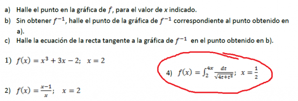 $$&f(x) =\int_2^{4x}\frac{dt}{\sqrt{4t+t^2}}=g(4x)-g(2)\\ &\\ &\\ &\\ &f´(x) = 4g´(4x)=\frac{4}{\sqrt{4(4x)+(4x)^2}}= \frac{1}{\sqrt{x+x^2}}\\ &\\ &\\ &f´(1/2) = \frac{1}{\sqrt{\frac 12+\frac 14}}=\frac{2}{\sqrt 3}=\frac{2 \sqrt 3}{3}$$La fórmula de la tangente en (xo,yo) es