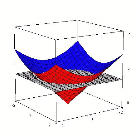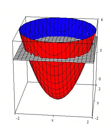 El volumen es la integral de las superficies de los círculos que se obtienen al cortar horizontalmente. Necesitamos conocer el radio de cada círculo dependiendo de la altura