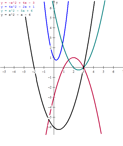 Tenemos estos 4 puntos (0,-3),(1,0),(2,1) y (3,0). Aparte sabemos que abre hacia abajo por ser negativo el coeficiente de x^2. Si se necesitan más puntos se dan.