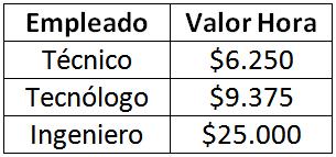 Para desarrollar el proyecto anterior se necesitan dos (2) tecnólogos, cuatro (4) técnicos y un (1) ingeniero cuya remuneración por hora se muestra en la tabla Nº 2.