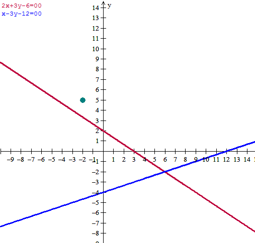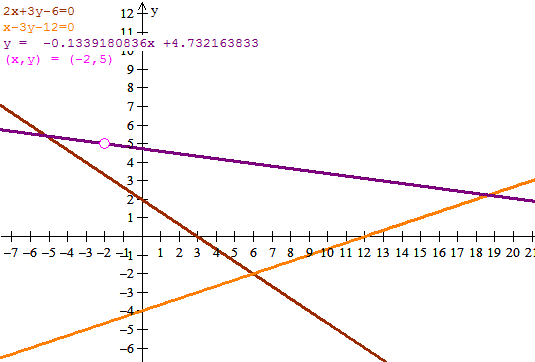 $$\begin{align}&L_3: \frac{x - 6 + 3k \sqrt{10}}{6+3k \sqrt{13}- 6+3k \sqrt{10}} =\frac{y + 2 - 2k \sqrt{10}}{-2+k \sqrt{13} +2-2k \sqrt{10}}\\ &\\ &\\ &\\ &L_3: \frac{x - 6 + 3k \sqrt{10}}{3k \sqrt{13}+3k \sqrt{10}} =\frac{y + 2 - 2k \sqrt{10}}{k \sqrt{13}-2k \sqrt{10}}\\ &\\ &\\ &\\ &\text{Simplificamos k en los denominadores}\\ &\\ &L_3: \frac{x - 6 + 3k \sqrt{10}}{3 \sqrt{13}+3 \sqrt{10}} =\frac{y + 2 - 2k \sqrt{10}}{ \sqrt{13}-2 \sqrt{10}}\end{align}$$sustituimos (x,y) por (-2,5) que es el punto por donde debe pasar