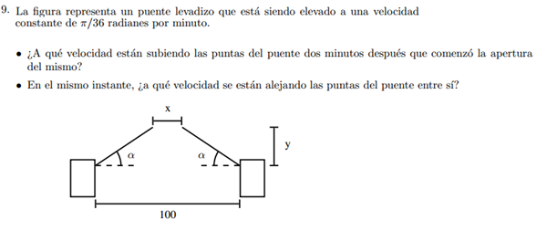 Las puntas del puente tienen una velocidad que es un vector cuya dirección es tangente a la circunferencia que describen. Y este vector se puede descomponer en los ejes X e Y, la componenente en X nos indicará la velocidad con que alejan del centro y la componente en Y la velocidad con la que suben. Simplemente debemos conocer el ángulo que forman en ese instante para hacer los cálculos trigonométricos.