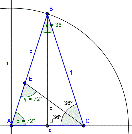 No sé si tienes varios métodos que me podrías explicar ya que en mi libro dibujaron un triangulo isósceles que tiene estos ángulos: 72, 72 y 36... Donde un angulo de 72 lo partieron a la mitad (bisectriz) y formaron otro triangulo que tiene también los mismos ángulos y no me dicen como sacaron el Cos 72 D: