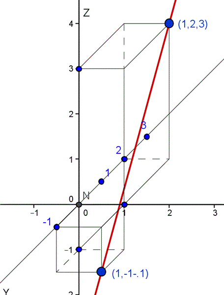 Gráfica la ecuación de la recta dada en el ejemplo anterior x=1, y=-3t+2, z=-4t+3.