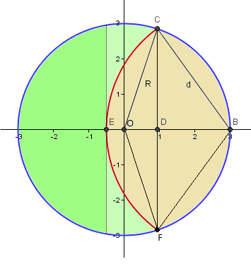 $$\begin{align}&\widehat{COF} =2arcos \frac{\overline{OD}}{R}=\\ &\\ &2arccos \frac{\frac{2R^2-d^2}{2R}}{R}=\\ &\\ &2arcos \frac{2R^2-d^2}{2R^2}\\ &\\ &2arcos \left(1-\frac{d^2}{2R^2}\right)\\ &\\ &\\ &\\ &\widehat{CBF}= 2arcos \frac{R-\overline{OD}}{d}=\\ &\\ &2arccos \frac{R-\frac{2R^2-d^2}{2R}}{d}=\\ &\\ &2arcos \frac{2R^2-2R^2+d^2}{2Rd}=\\ &\\ &2arcos \frac{d^2}{2Rd} =\\ &\\ &2arcos \frac d{2R}\end{align}$$El área de cada sector es su respectivo radio al cuadrado por la mitad del ángulo medido en radianes. Recuerda que de una circunferencia con ángulo 2Pi radianes tenemos un círculo con área Pi·R^2. Con todos los elementos calculados se forma esta ecuación