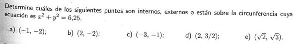 $$\begin{align}&\text{Para }(\sqrt 2,\sqrt 3);\quad (\sqrt 2)^2+(\sqrt 3)^2=2+3=5\le6.25\quad \\ &\\ &\text{es interno}\end{align}$$La otra pregunta tiene demasiados ejercicios. Lo habitual es que cada pregunta tenga un solo ejercicio salvo cuando sean extremadamente fáciles.