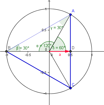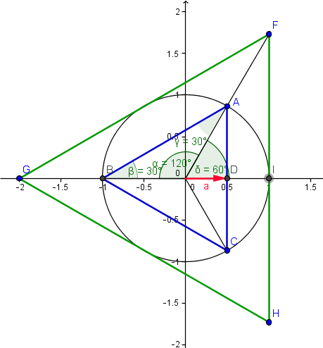 Cada ángulo del triángulo equilátero mide 60º. Lo situamos de modo que el eje X sea la bisectriz del ángulo en B. Asi el ángulo beta=30º. Como el triángulo ABO es isósceles al tener dos lados iguales al radio el ángulo gamma = 30º. Y entonces el angulo del triangulo que queda es alfa = 180º - 30º-30º = 120º