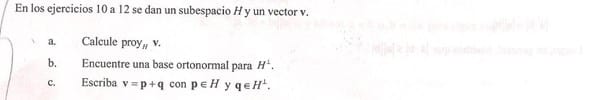 $$u_2=b_2-proy_{u_1}(b_2)\\ \\ u_2=b_2-\frac{\lt u_1,b_2\gt}{\lt u_1,u_1 \gt}u_1\\ \\ \\ u_2=(-1, 2, 0, 0)-\frac{-1}{5}(1,0,0,2)=\\ \\ u_2=\left(-\frac 45,2,0,\frac 25\right)\\ \\ \text {La norma del segundo vector es:}\\ \\ \\ \sqrt{\frac{16}{25}+4+\frac{4}{25}}= \sqrt{\frac{120}{25}}=\frac{2 \sqrt {30}}{5}\\ \\ \\ \text{y la base ortonormal es:}\\ \\ \\ B=\left\{\left( \frac{1}{\sqrt 5},0,0,\frac{2}{\sqrt 5}\right),\left(\frac{-2}{\sqrt {30}},\frac{5}{\sqrt{30}},0,\frac{1}{\sqrt{30}} \right) \right\}$$ c) v = p+q con p € H y q € ortogonal(H)
