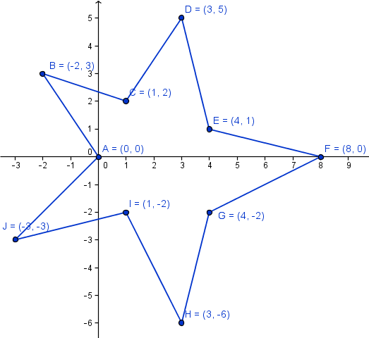 (0,0); (-2,3); (1,2); (3,5); (4,1); (8,0);(4,-2); (3,-6); (1,-2) y (-3,-3)