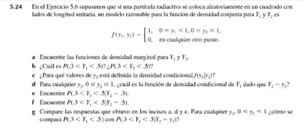 $$\begin{align}&f_1(y_1)=\int_0^1dy2 =[y_2]_0^1 = 1 \;si\;0\le y_1 \le 1; 0 \;si \;no\\ &\\ &f_1(y_2)=\int_0^1dy1 =[y_1]_0^1 = 1 \;si\;0\le y_2 \le 1; 0 \;si \;no\end{align}$$b)