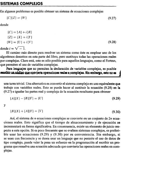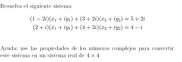 $$\begin{align}&(1-2i)(x_1+iy_1)+(3+2i)(x_2+iy_2)=5+2i\\ &x_1+iy_1-2ix_1-2i^2y_1+3x_2+3iy_2+2ix_2+2i^2y_2=5+2i\\ &x_1+iy_1-2ix_1+2y_1+3x_2+3iy_2+2ix_2-2y_2=5+2i\\ &x_1+2y_1+3x_2-2y_2 +i(y_1-2x_1+3y_2+2x_2)=5+2i\\ &\\ &\text{De aquí salen estas dos ecuaciones}\\ &x_1+2y_1+3x_2-2y_2=5\\ &y_1-2x_1+3y_2+2x_2 = 2\\ &\\ &\\ &\\ &(2+i)(x_1+iy_1)+(4+3i)(x_2+iy_2)=4-i\\ &2x_1+2iy_1+ix_1+i^2y_1+4x_2+4iy_2+3ix_2+3i^2y2=4-i\\ &2x_1+2iy_1+ix_1-y_1+4x_2+4iy_2+3ix_2-3y_2=4-i\\ &2x_1-y_1+4x_2-3y_2+i(2y_1+x_1+4y_2+3x_2)=4-i\\ &\\ &\text{Y las dos ecuaciones de aquí son}\\ &2x_1-y_1+4x_2-3y_2=4\\ &2y_1+x_1+4y_2+3x_2=-1\\ &\\ &\\ &\text{Vamos a ponerlas con las columnas alineadas}\\ &x_1+2y_1+3x_2-2y_2=5\\ &-2x_1+y_1+2x_2+3y_2 = 2\\ &2x_1-y_1+4x_2-3y_2=4\\ &x_1+2y_1+3x_2+4y_2=-1\end{align}$$ El editor de ecuaciones ya no aguanta más líneas