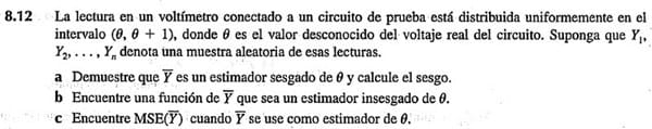 $$\begin{align}&f(\overline{Y}) = \overline{Y}-\frac 12\\ &\\ &\text{con esto será}\\ &\\ &E[f(\overline{Y})] = E(\overline{Y})-1/2 = \theta+\frac 12- \frac 12=\theta\\ &\\ &\text{y f será un estimador insesgado de }\theta\end{align}$$c)