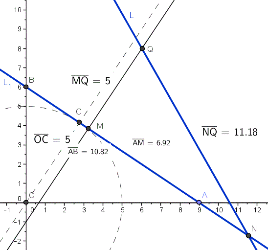 Ahora vamos a calcular el punto Q, lo haremos sumando al punto M el vector perpendicular a la recta L de longitud 5