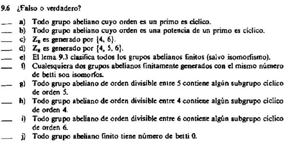 e) Verdadero. Reduce todos los grupos abelianos finitos a productos directos de grupos Zn con n primo o potencia de primo; o a productos directos Zmi donde cada m sub i divide a m sub (i+1)