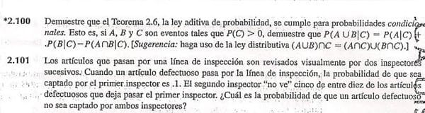 2.100 Supongo que con A U B|C se refieren a (AUB)|C y no a A U (B|C). Bueno, si no sale lo primero a lo mejor es lo segundo. P((AUB)|C) = P((AUB) n C) / P(C) = Hacemos uso de la propiedad distributiva que nos dicen: = P((A n C) U (B n C)) / P(C) = [P(A n C) + P(B n C) - P ((A n C) n (B n C))] / P(C) = [P(A n C) + P(B n C) - P(A n B n C)] / P(C) = P(A n C) / P(C) + P(B n C) / P(C) - P((A n B) n C) / P(C) = P(A|C) + P(B|C) - P((AnB)|C) -------------------- 2.101 La probabilidad de sortear la primnera inspección es 0,9. El segundo inspector no ve 5 de entre diez, eso es que no ve 0,5 Y el segundo inspector dejará de ver 0,5 · 0,9 = 0,45 Luego la probabilidad de que no sea captado por ninguno de los dos es 0,45. Ya veo que en el libro pone otra solución, pero se han vuelto a equivocar en la solución o en el enunciado. En efecto, se equivocaron en el enunciado. Donde decían "de que sea captado por el primer" deberían decior "de que NO sea captado". Entonces sí, sortearían el primer sorteo 0,1 artículos y el segundo no captaría 0,5 · 0,1 = 0,05 Y eso es todo.