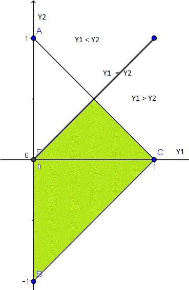 El triángulo ABC es la zona donde la probabilidad no es nula. La recta Y1=Y2 divide el plano en dos zonas, una donde Y1 < Y2 que es la superior y otro done Y1> y2 que es la inferior y de la que nos piden la probabilidad, luego la P(Y1>Y2) es la de la zona de verde.