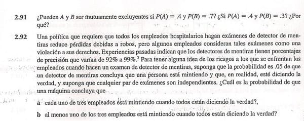 2.91 No, puesto que si son mutaumente excluyentes P(A n B) = 0 con lo que P(AUB) = P(A) + P(B) - P(A n B) = 0,4+0,7-0 = 1,1 que es mayor de 1 y es contradictorio. En el segundo caso sí. P(AUB) = 0,4+0,3-0 = 0,7 es menor o igual que 1 ---------------------- 2.92 a) Será la suma de probabilidades de que la máquina se equivoque con el primero y acierte con los otros dos, falle con el segundo y acierte con 1º y 3º y finalmente que falle con el tercero y acierte con 1º y 2º Cada uno de estos casos tiene una probabilidad de darse de P(Fallar con uno concreto y acertar con los otros dos) = 0,05 · 0,95 · 0,95 = 0,045125 P(fallar con uno cualquiera y acertar con los otros 2 ) = 3 · 0,045125 = 0,135375 Eso es lo que piden aunque no usa las mismas palabras exactamente. b) Se puede usar la fórmula que aparece en el libro tras el teorema 2.6 P(AUBUC) = P(A) + P(B) + P(C) - P(A n B) - P(A n C) - P(B n C) + P(A n B n C) P(A)=P(B)=P(C) = 0,05 P(A n B) = P(A n C) = P(B n C) = 0,05 · 0.05 = 0,0025 P(A n B n C) = 0,05 · 0,05 · 0,05 = 0,000125 P(AUBUC) = 3 · 0,05 - 3 · 0,0025 + 0,000125 = 0,142625 Y eso es todo.