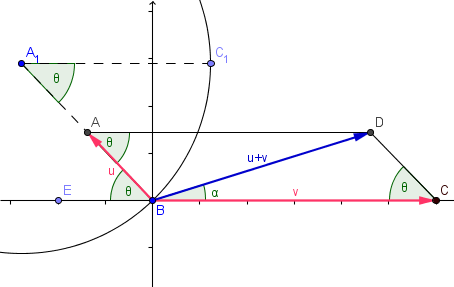 Llamaré u al vector de 1000 unidades y v al de 3000 unidades. Si completamos el paralelogramo y llamamos A al punto donde termina u, B al punto de la circunferencia, C al punto donde termina v y D al que falta. Desde A tendremos el lado AB que mide 1000 y el lado horizontal AD que mide 3000. El ángulo interno del paralelogramo en A es theta ya que es el ángulo correspondiente a theta por una recta paralela. Y el vector suma es la diagonal BD.